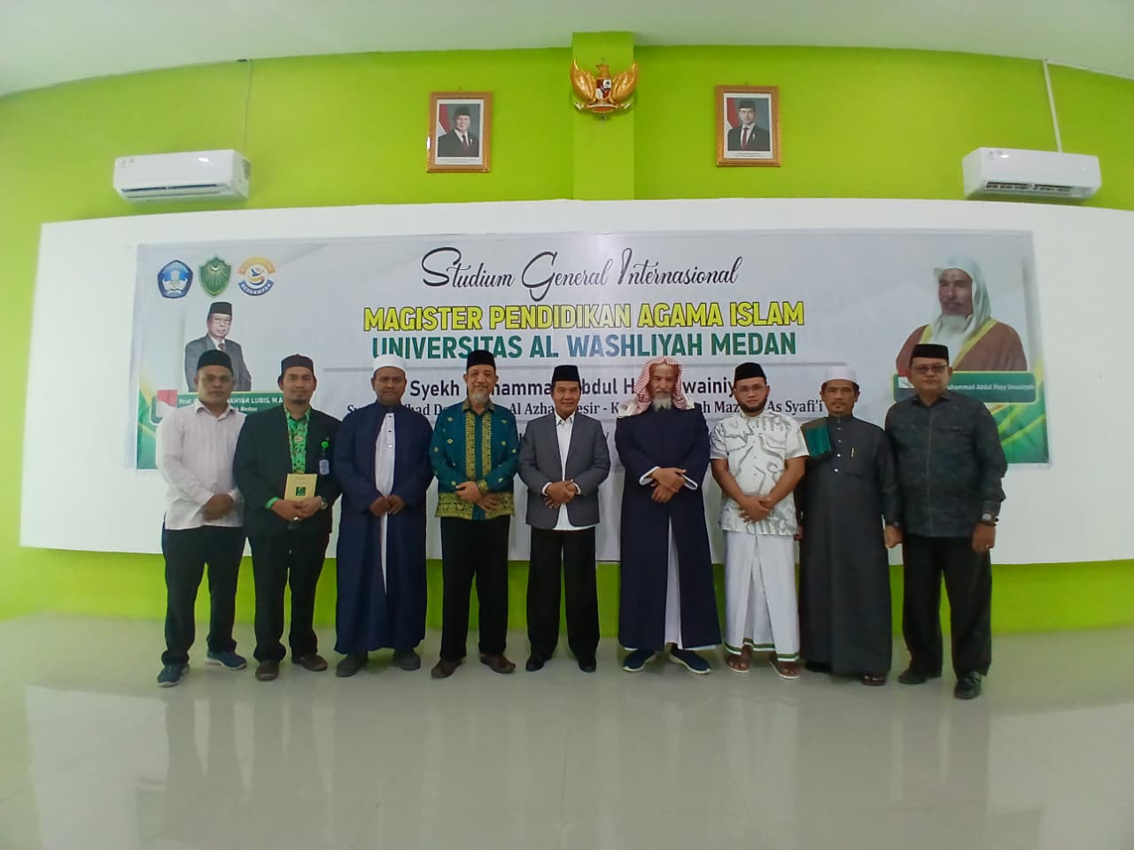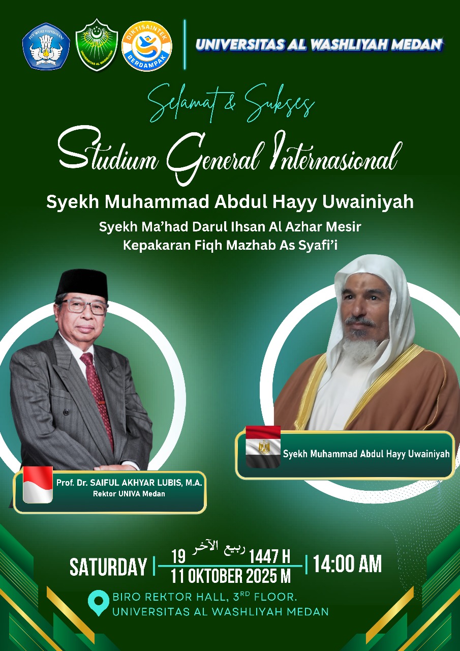 MEDAN – Universitas Al Washliyah (Univa) Medan menggelar diskusi ilmiah dengan menghadirkan Syekh Muhammad Abdul Hayy Uwainiyah, seorang ulama dari Mesir yang merupakan pakar Fiqh Mazhab Asy-Syafi’i dari Mah’ad Darul Ihsan Al Azhar Mesir, pada hari Sabtu 11 Oktober 2025/19 Rabiul Akhir 1447 H, di Aula Biro Hall Rektor, Lantai 3, kampus Universitas Al Washliyah, Medan, Sumatera Utara.